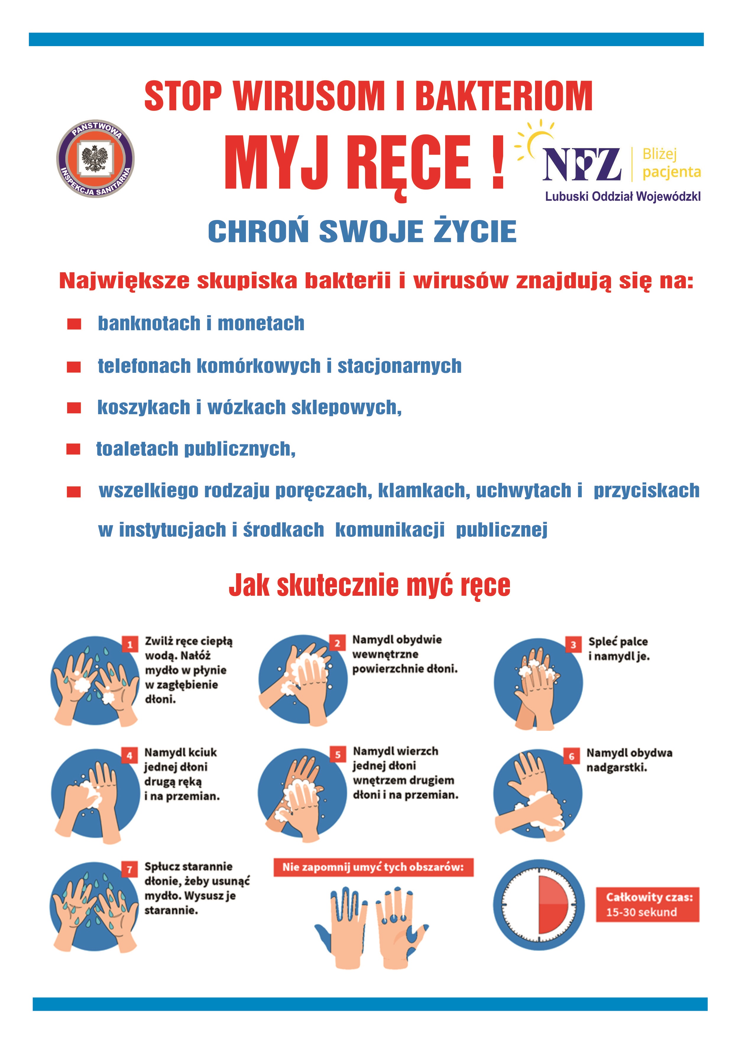Lubuski Oddział Wojewódzki NFZ wspólnie z Wojewódzką Stacją Sanitarno-Epidemiologiczną w Gorzowie Wielkopolskim realizuje kampanię informacyjną na temat prawidłowej higieny rak. Do akcji włączył się również Miejski Zakład Komunikacji w Zielonej Górze i Gorzowie Wielkopolskim poprzez zamieszczenie w autobusach plakatów informacyjnych na temat instruktarzu prawidłowego mycia rąk. W ramach kampanii jutro tj. 23 października w Oddziale odbędą się spotkania edukacyjne na temat zagrożeń jakie powodują bakterie na naszych rękach, które w konsekwencji mogą być przyczyną licznych chorób.  Wystarczy odruchowo dotknąć nieumytymi rękami okolic oczu, nosa czy ust i jesteśmy narażeni na ogromne ryzyko infekcji. Mycie rąk to najprostsza i jedna z najbardziej skutecznych metod zapobiegania zatruciom pokarmowym, grypie, chorobom pasożytniczym i skórnym. Niestety często jest bagatelizowana. Bardzo ważne jest to, by myć ręce regularnie.