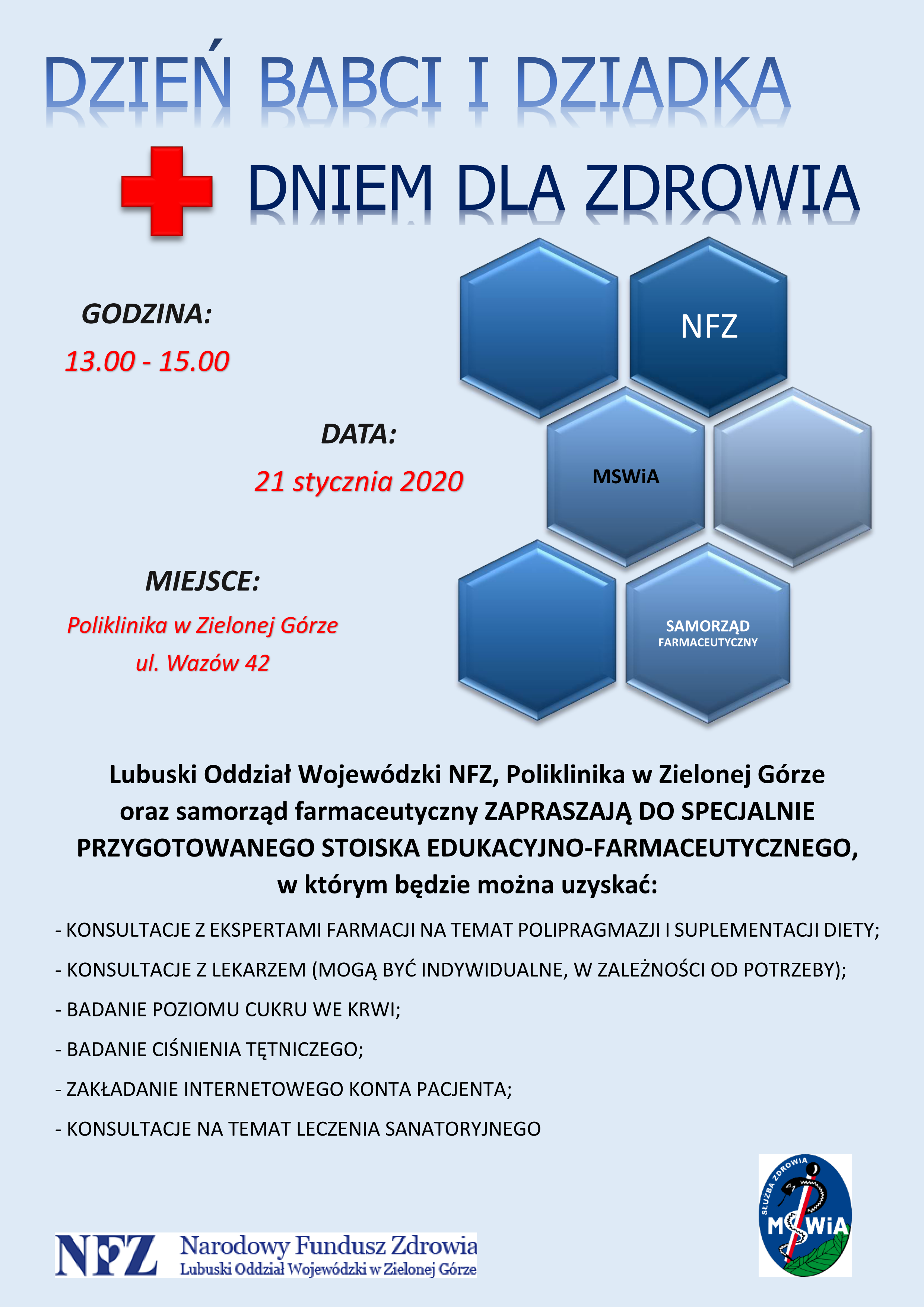 Lubuski Oddział Wojewódzki NFZ, SP ZOZ MSWiA w Zielonej Górze oraz samorząd farmaceutyczny zapraszają Seniorów na specjalnie przygotowane stoisko edukacyjno-informacyjne z wyjątkową ofertą zdrowotną: