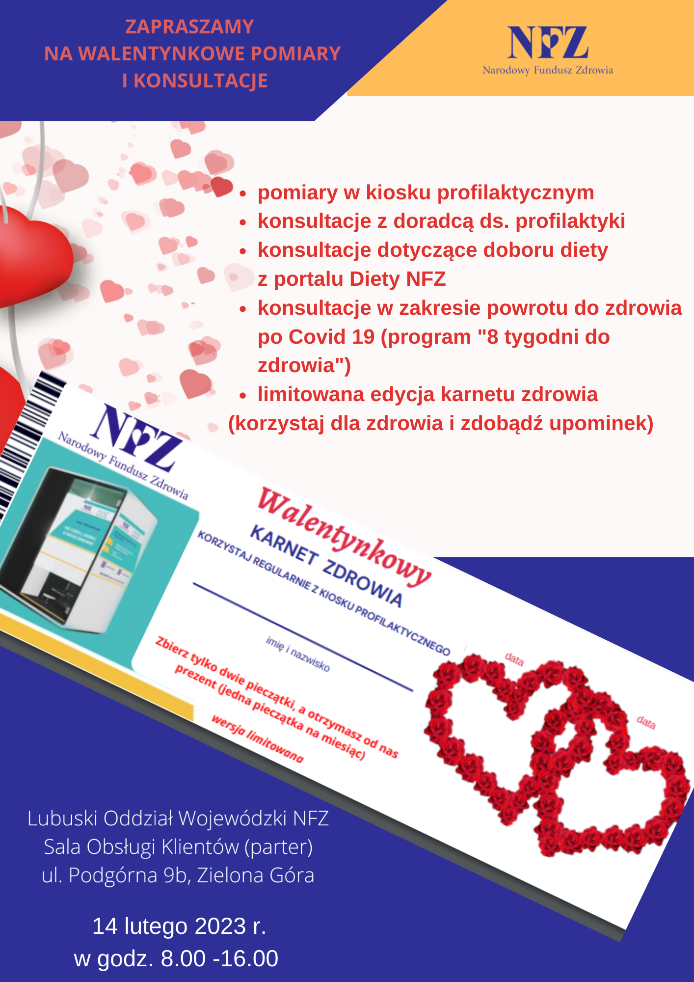 14 lutego 2023 r. zapraszamy do Sali Obsługi Klienta, każdy klient, który skorzysta z kiosku profilaktycznego otrzyma limitowaną wersję naszego Karnetu Zdrowia.