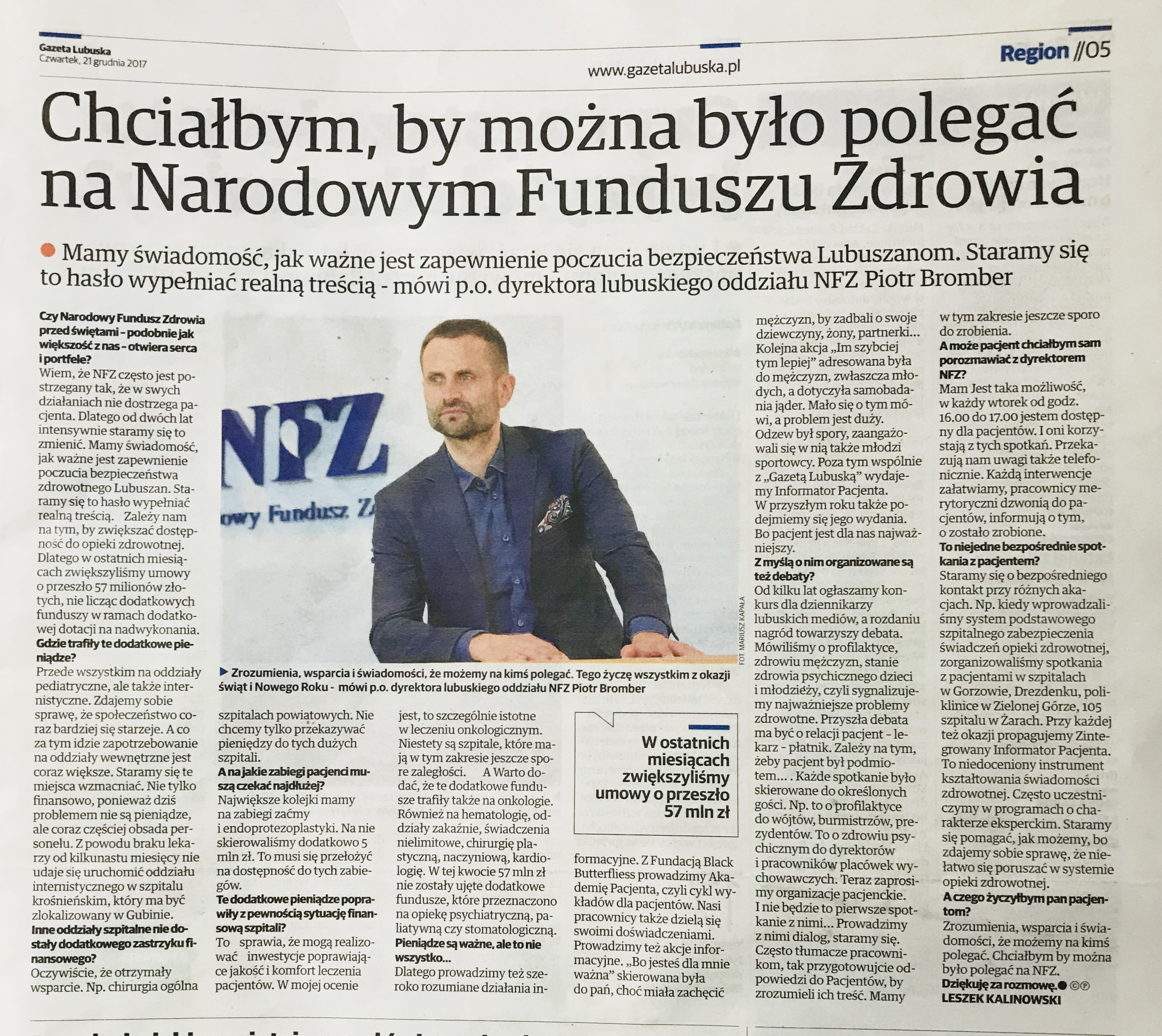 Z mikołajkowymi życzeniami LOW NFZ wspólnie z organizacją Kwiat Kobiecości oddział Zielona Góra, odwiedził Wielospecjalistyczny Wojewódzki Szpital w Gorzowie Wielkopolskim oraz Szpital Uniwersytecki w Zielonej Górze. W ramach akcji, pacjentki oddziałów onkologicznych i ginekologicznych wraz z życzeniami otrzymały drobne upominki i materiały informacyjne dotyczące profilaktyki zdrowotnej. Celem akcji było dotarcie do kobiet z informacją o konieczności wykonywania regularnych badań cytologicznych i mammograficznych oraz wsparcie kobiet, które właśnie walczą z chorobą nowotworową.
