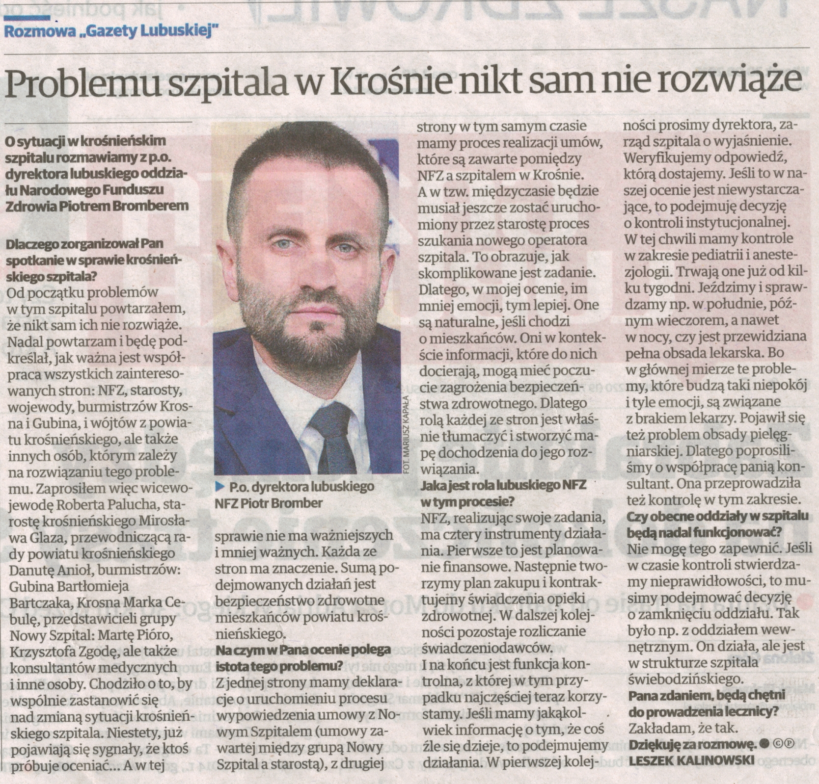 W sobotę (1 października 2016) w siedzibie LOW NFZ miał miejsce briefing prasowy dotyczący sytuacji w Nowym Szpitalu Powiatu Krośnieńskiego Sp. z o.o. W spotkaniu z mediami wziął udział Piotr Bromber, p.o. Dyrektora LOW NFZ i Robert Paluch, Wicewojewoda Lubuski.