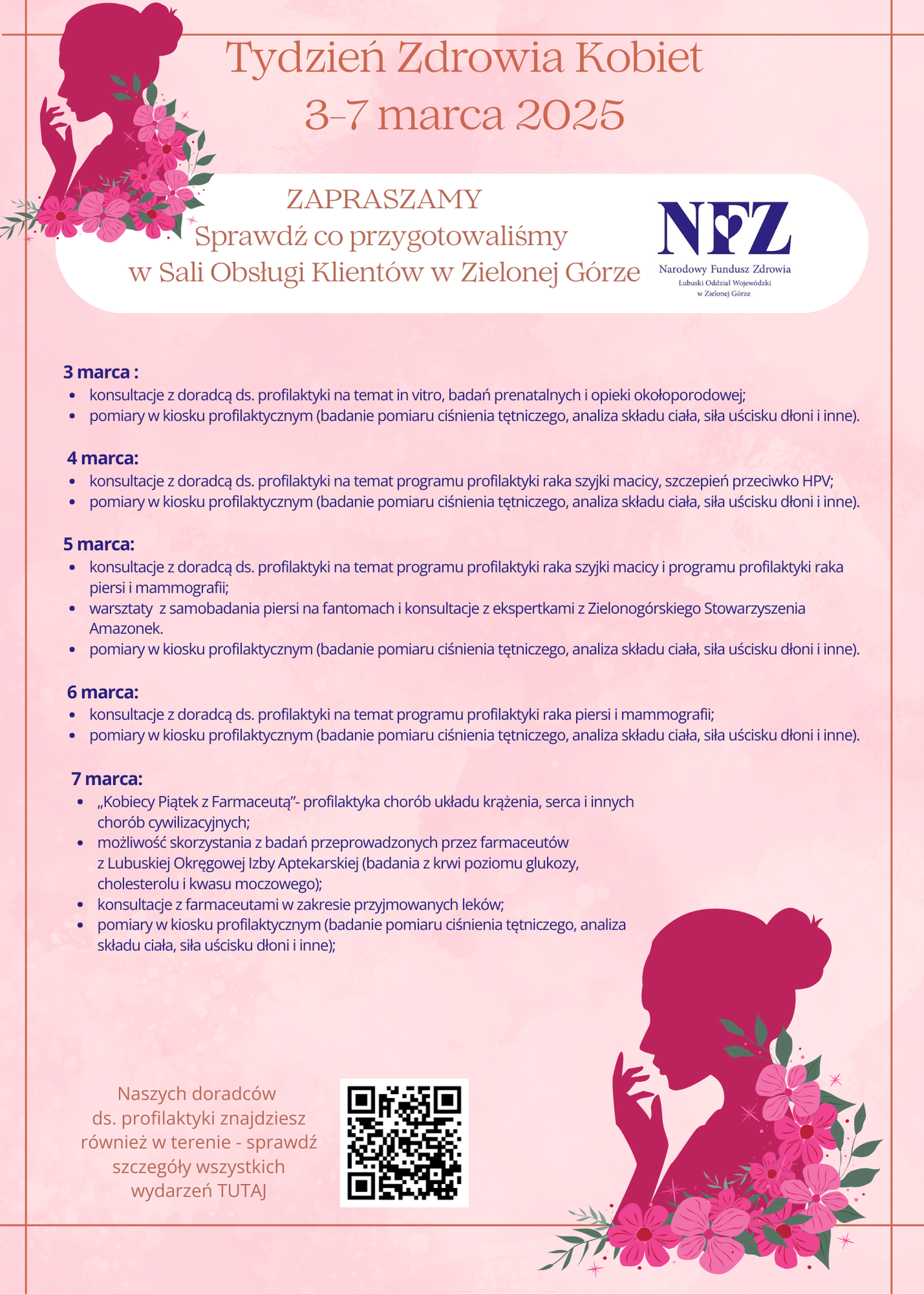 6 marca – „Dzień Lubuskich Kobiet”, wydarzenie Lubuskiego Ośrodku Doradztwa Rolniczego (LODR) i NFZ w Kalsku od godz. 9.00, prelekcja na temat programów profilaktycznych doradcy ds. profilaktyki i stoisko edukacyjne: analiza składu ciała, warsztaty z samobadania piersi – rak piersi, program profilaktyki raka piersi (mammografia).