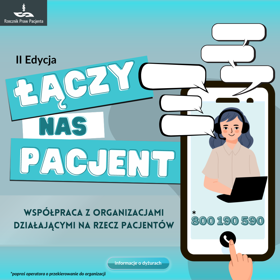 ,,Łączy nas pacjent” to projekt Rzecznika Praw Pacjenta oraz organizacji pozarządowych, działających na rzecz pacjentów. Celem są wspólne działania polegające na udzielaniu wsparcia osobom zgłaszającym się na ogólnopolską bezpłatną Infolinię 800 190 590. Projekt zakłada, że pacjenci i ich bliscy kontaktujący się z Rzecznikiem za pośrednictwem Infolinii, będą mogli porozmawiać nie tylko ze specjalistami Biura Rzecznika Praw Pacjenta, ale też dyżurującym ekspertem danej organizacji. Dzięki temu uzyskają kompleksową informację i wsparcie w zakresie danego schorzenia lub obszaru opieki zdrowotnej.