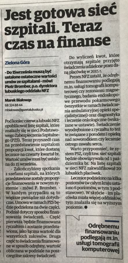 Wczoraj tj. 31 sierpnia br. w siedzibie LOW NFZ zakończyły się spotkania z Dyrektorami oraz Prezesami lubuskich szpitali zakwalifikowanych do systemu podstawowego szpitalnego zabezpieczenia świadczeń opieki zdrowotnej, na których przedstawione zostały propozycje finansowania na pierwszy okres rozliczeniowy w nowym systemie. Wartości kontraktów w każdym przypadku są wyższe niż dotychczas.
