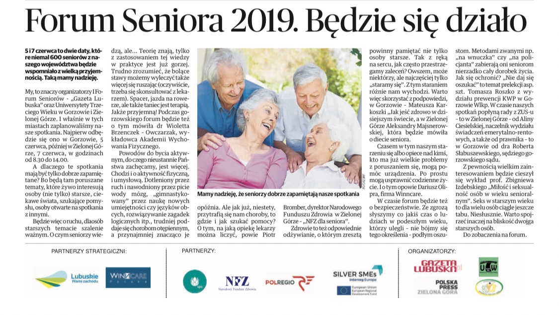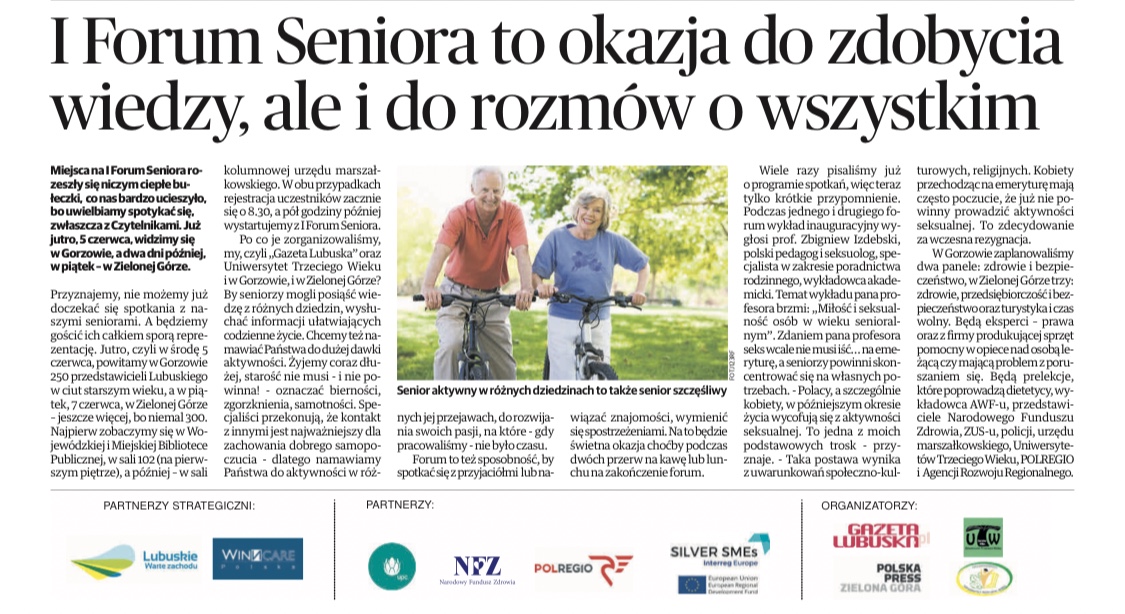 LOW NFZ był partnerem merytorycznym I Forum Seniora organizowanego przez Gazetę Lubuską. Podczas spotkań odbył się cykl wykładów o tematyce senioralnej. LOW NFZ w ramach Forum przygotował stoisko informacyjne na temat drowia seniora, profilaktycznych programów zdrowotnych oraz szczególnych uprawnień w zakresie opieki zdrowotnej. Uczestnicy mogli również uzyskać dostęp do Internetowego Konta Pacjenta oraz wyrobić Europejską Kartę Ubezpieczenia Zdrowotnego. Pierwszy dzień Forum odbył się 5 czerwca w Bibliotece Wojewódzkiej w Gorzowie Wielkopolskim, drugi dzień tj. 7 czerwca w Sali Kolumnowej Urzędu Marszałkowskiego w Zielonej Górze.