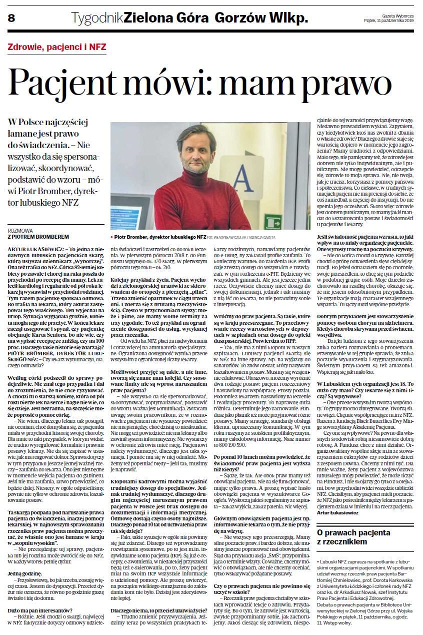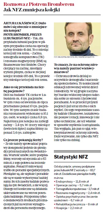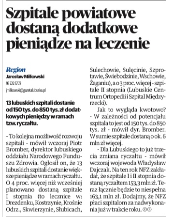 Dodatkowych 6 milionów złotych trafi do 13 lubuskich szpitali. W głównej mierze dotyczy to szpitali powiatowych. O tym wczoraj tj. 10 września br. poinformował Piotr Bromber Dyrektor LOW NFZ podczas spotkania z dyrektorami i prezesami szpitali. W spotkaniu uczestniczyli również Wojewoda Lubuski Władysław Dajczak oraz Wicewojwoda Lubuski Wojciech Perczak. Po spotkaniu odbył się briefing prasowy poświęcony temu tematowi.