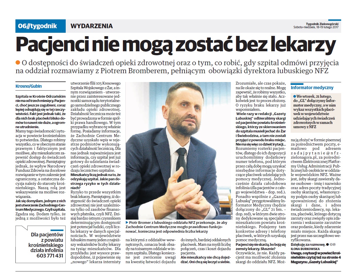 Na antenie Radia Zachód, 26 stycznia br. odbyła się rozmowa prowadzona przez red. Karolinę Kamińską dotycząca organizacji perinatalnej opieki paliatywnej. W spotkaniu wzięli udział: Piotr Bromber - pełniący obowiązki Dyrektora Lubuskiego Oddziału Wojewódzkiego NFZ, Sławomir Gąsior – lekarz specjalista Kierownik Klinicznego Oddziału Położnictwa i Ginekologii Wojewódzkiego Szpitala Klinicznego w Zielonej Górze, Jakub Czwojda lekarz specjalista z Oddziału Neonatologicznego Łucja Majkut – Położna Oddziałowa Oddziału Ginekologiczno-Położniczego Pionu Ginekologicznego oraz Patrycja Łychmus – Wiceprezes Stowarzyszenia Przyjaciół Osób z Zespołem Downa w Zielonej Górze.