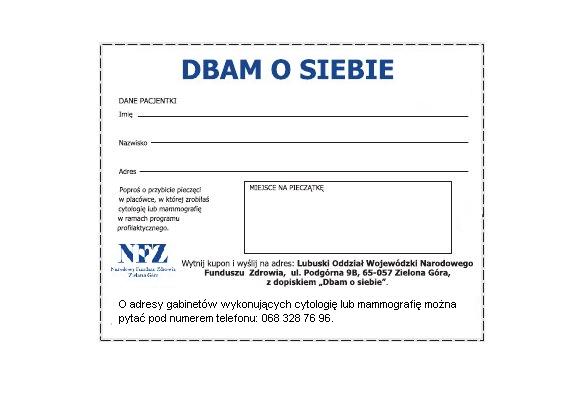 Drogie Lubuszanki! 8 marca to wspaniała okazja, by nareszcie zrobić coś dla siebie. Co konkretnie? Skorzystać z naszej propozycji, czyli bezpłatnych badań profilaktycznych - mammografii i cytologii. Panie, które znajdą czas i zrobią jedno z tych badań, moga liczyć na atrakcyjne upominki.