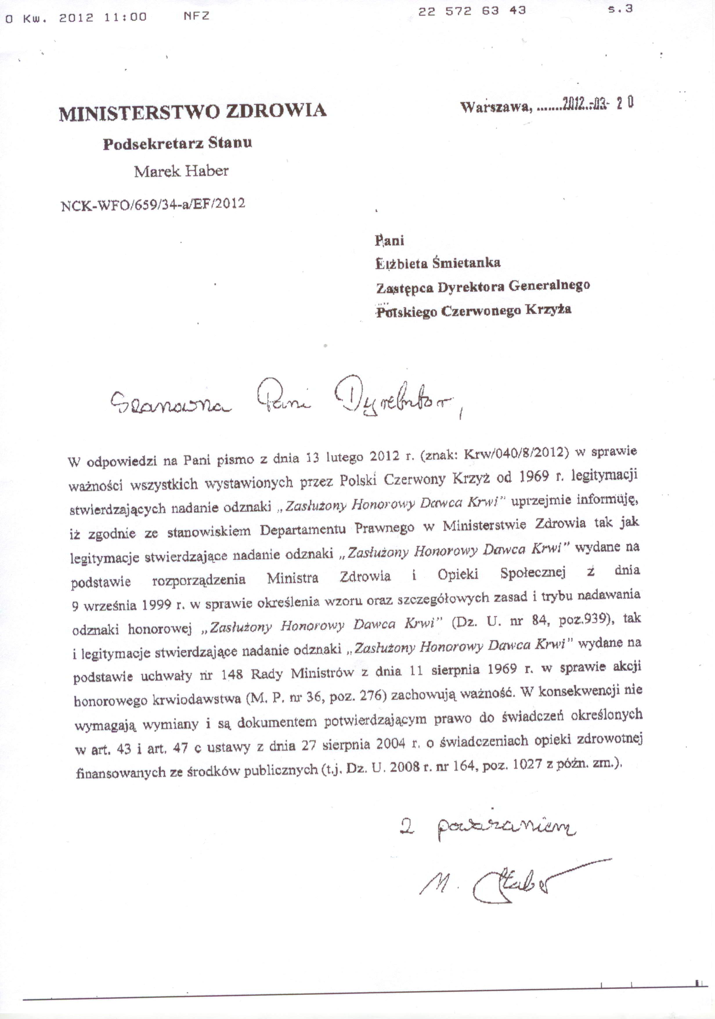 Przedstawiamy stanowisko Ministerstwa Zdrowia w sprawie uprawnień osób posiadających legitymację "Zasłużony Honorowy Dawca Krwi" wystawioną w latach 1969-2006. Szczegóły w załączniku - piśmie Podsekretarza Stanu Marka Habera do Elżbiety Śmietanki, Zastępcy Dyrektora Generalnego PCK.