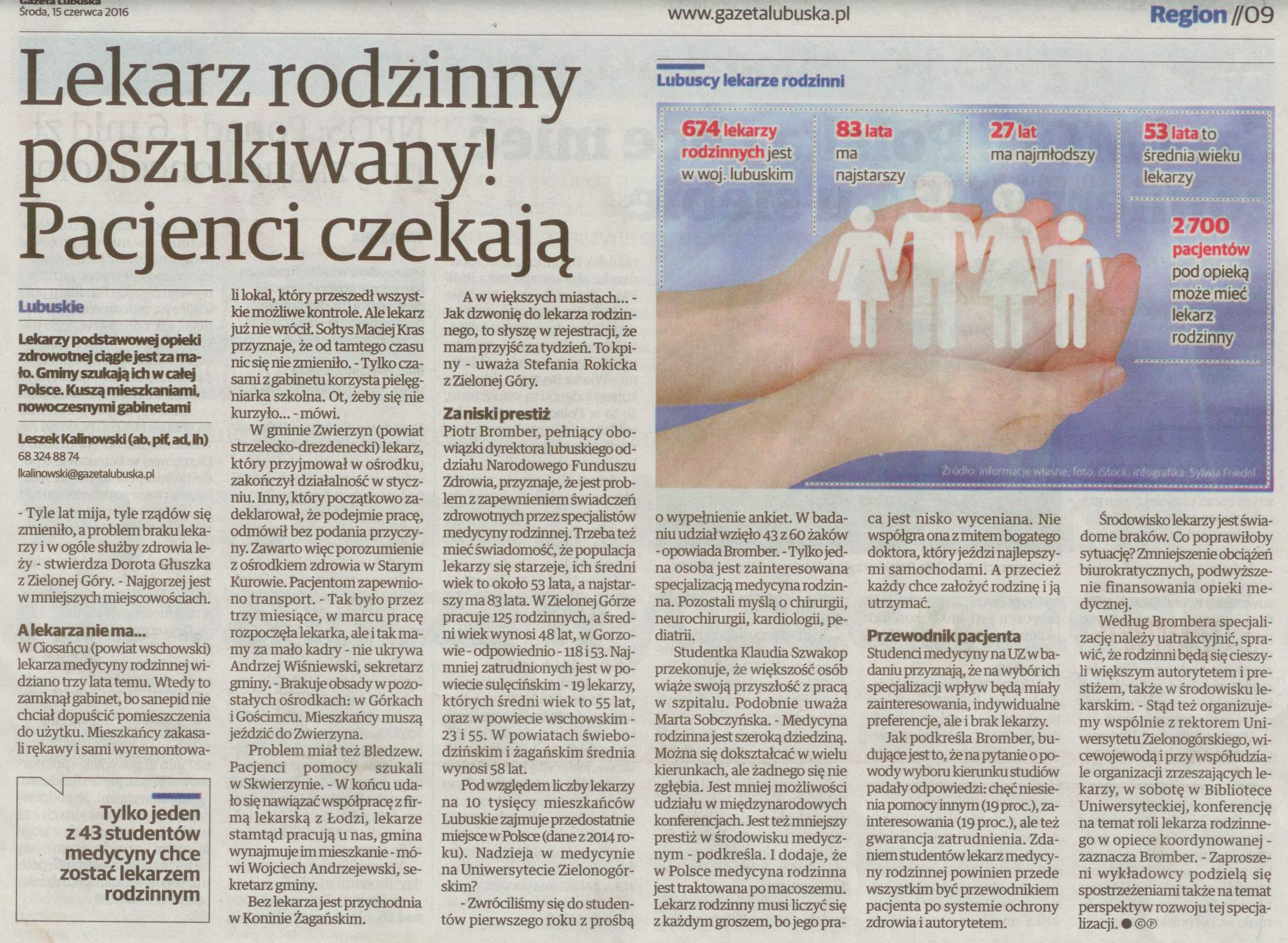 Konferencja "Rola lekarza rodzinnego w opiece koordynowanej", odbyła się 18 czerwca w budynku Biblioteki Uniwersytetu Zielonogórskiego. Była adresowana do środowiska lekarzy podstawowej opieki zdrowotnej. Uczestniczyli w niej m. in.: Artur Zasada, Poseł na Sejm RP; Izabela Trojanowska, Dyrektor Generalna w Ministerstwie Zdrowia; Andrzeja Jacyna, p.o. Prezesa Narodowego Funduszu Zdrowia; Robert Paluch, Wicewojewoda Lubuski; prof. Wojciech Strzyżewski, Prorektor Uniwersytetu Zielonogórskiego; Dariusz Dziełak, Dyrektor Departamentu Analiz i Strategii Centrali Narodowego Funduszu Zdrowia; Agnieszka Jankowska – Zduńczyk, Konsultant Krajowy w dziedzinie Medycyny Rodzinnej; dr Jacek Krajewski, Prezes Federacji Porozumienie Zielonogórskie; Magdalena Kraszewska, Dyrektor Wielkopolskiego Oddziału Wojewódzkiego Narodowego Funduszu Zdrowia; Bożena Chudak, Dyrektor Wydziału Zdrowia Lubuskiego Urzędu Wojewódzkiego; Katarzyna Łasińska, Kanclerz Uniwersytetu Zielonogórskiego; dr Elżbieta Tomiak i Dariusz Jałocha, Konsultanci Wojewódzcy w dziedzinie Medycyny Rodzinnej; Marek Twardowski, Prezes Lubuskiego Związku Lekarzy Pracodawców POZ Porozumienie Zielonogórskie wraz z Członkami Zarządu; dr Zbigniew J. Król, Członek Honorowy Kolegium Lekarzy Rodzinnych w Polsce; dr Tomasz Kremer, Prezes Lubuskiego Oddziału Wojewódzkiego Kolegium Lekarzy Rodzinnych; Jacek Zajączek, Prezes Okręgowej Rady Lekarskiej w Gorzowie Wlkp.; dr Mariusz Witczak, Przewodniczący Okręgowej Rady Lekarskiej w Zielonej Górze; Marta Powchowicz, Przewodnicząca Okręgowej Izby Pielęgniarek i Położnych w Gorzowie Wlkp.; Weronika Rozenberger, Przewodnicząca Okręgowej Izby Pielęgniarek i Położnych w Zielonej Górze; Władze Wydziału Lekarskiego i Nauk o Zdrowiu UZ: Prodziekan ds. Kształcenia prof. Agnieszka Zembroń – Łacny i Prodziekan ds. studenckich dr Ewa Skorupka.