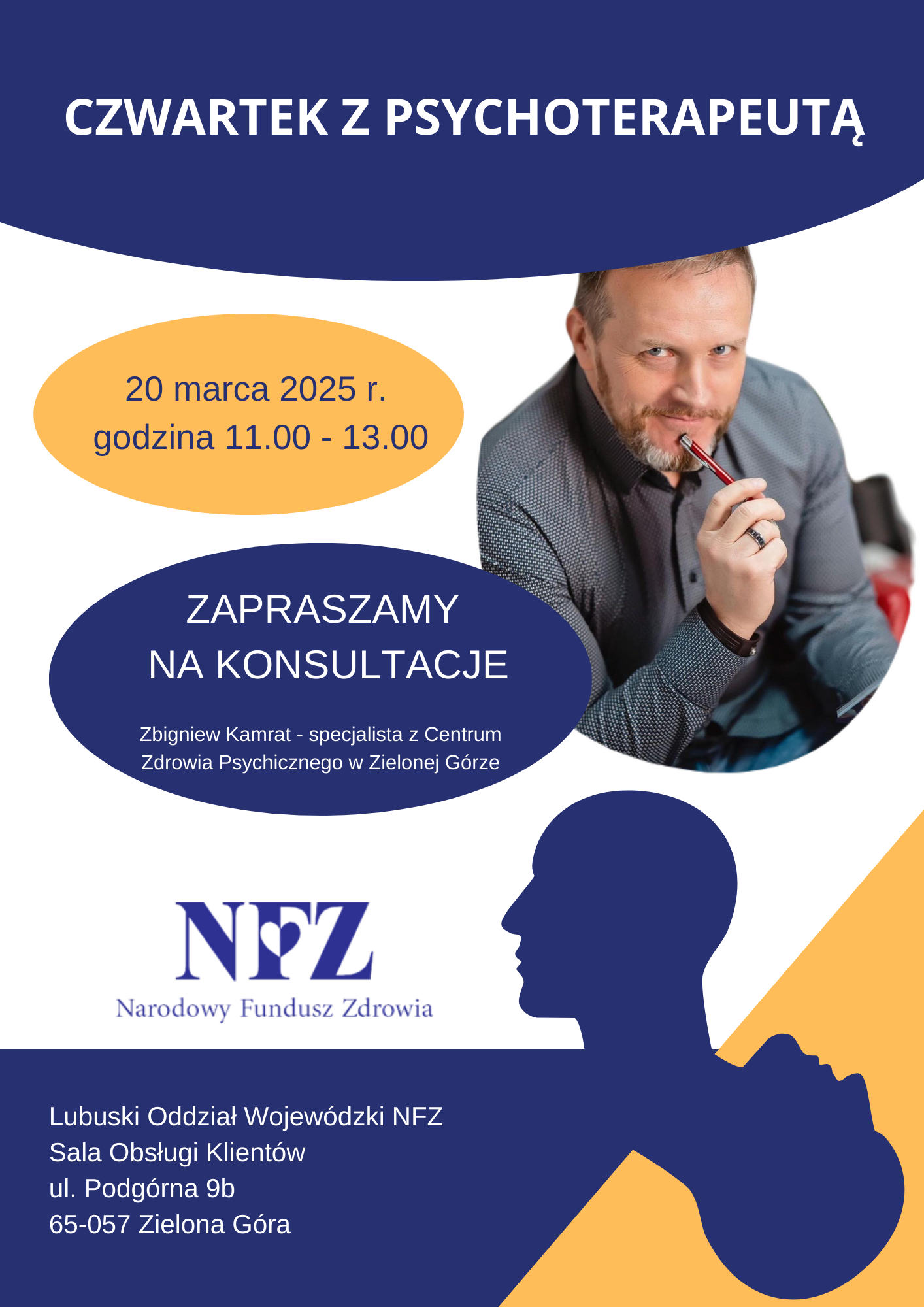 Już 20 marca 2025 r. w godz. 11.00 - 13.00. w siedzibie Lubuskiego Oddziału Wojewódzkiego NFZ będzie można skorzystać z indywidualnych konsultacji z psychoterapeutą, specjalistą, który na co dzień udziela świadczeń w ośrodku działającym w ramach Centrum Zdrowia Psychicznego w Zielonej Górze.