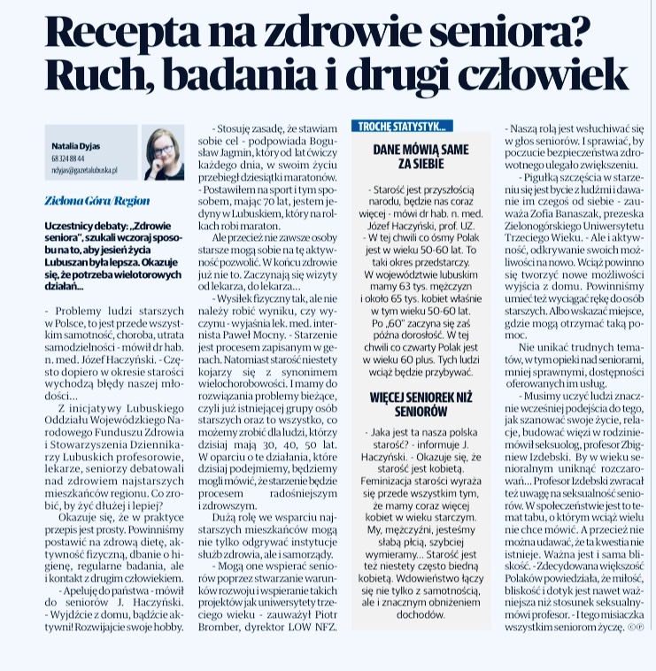 Z inicjatywy Lubuskiego Oddziału Wojewódzkiego NFZ przy współpracy ze Stowarzyszeniem Dziennikarzy Lubuskich 3 kwietnia br. w bibliotece Uniwersytetu Zielonogórskiego odbyła się debata pn. „Zdrowie seniora”. Debata połączona była z uroczystym rozstrzygnięciem konkursu dla lubuskich mediów. Lubuski Oddział Wojewódzki NFZ od dziewięciu lat organizuje konkurs dla dziennikarzy województwa lubuskiego. Temat tegorocznego konkursu to „Zdrowie seniora”.